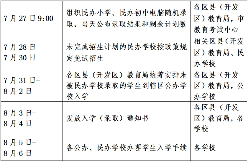 未完成招生计划的民办学校可向区县(开发区)教育行政部门申请补录,由学校在招生计划内按照政策规定免试招生,补录招生方式和招生范围由区县(开发区)教育行政部门审定,招生结果经区县(开发区)教育行政部门审核后录入招生平台。未被民办学校录取的学生,由区县(开发区)教育行政部门安排到对应学区公办学校,若无空余学位,统筹安排到其他公办学校。任何学校不得录取已被其他学校录取的学生。